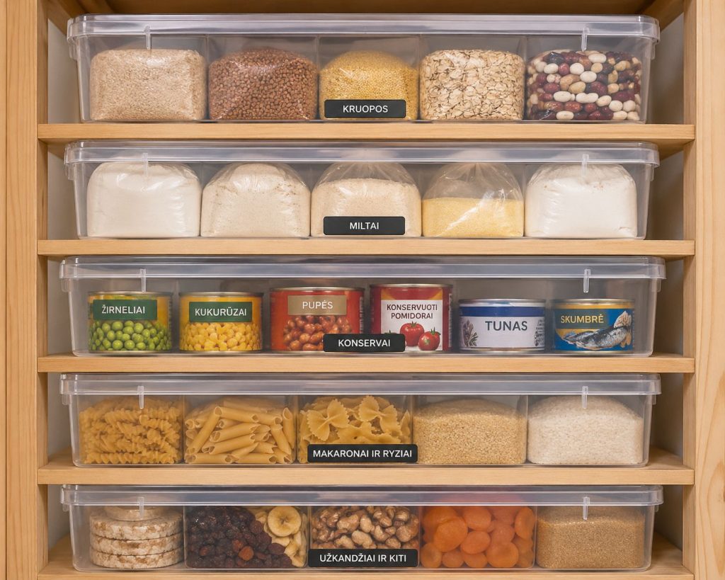 Sukaupus atsargas, kyla kitas klausimas – kur jas dėti? Ne visi Lietuvoje gyvena erdviuose namuose su atskirais rūsiais. Dažnas iš mūsų glaudžiasi butuose, kur kiekvienas kvadratinis metras yra aukso vertės. Tačiau atsargų dėžė nebūtinai turi užimti visą kambarį. Tai gali būti tiesiog vieta po lova, viršutinė spintos lentyna ar netvarkingas kampas balkone, jei jis apšiltintas.