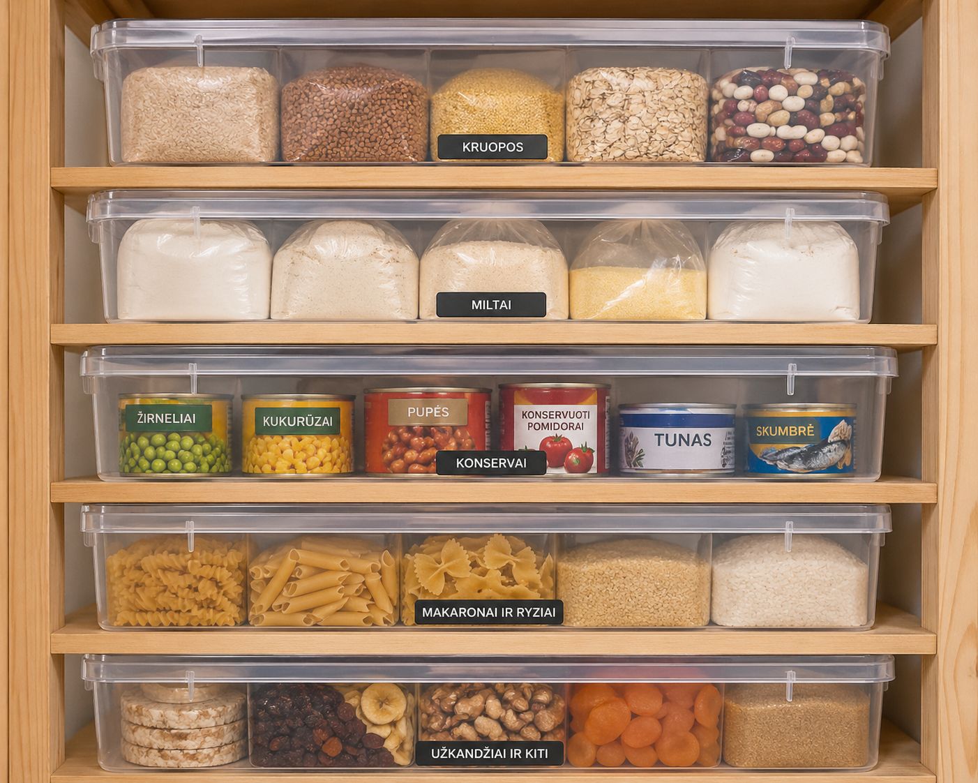 Svarbiausia taisyklė – tamsa, sausumas ir vėsuma. Kruopos nemėgsta drėgmės, o konservai – tiesioginių saulės spindulių. Vertėtų naudoti plastikines dėžes su dangčiais, kad apsaugotumėte maistą nuo galimų kenkėjų, pavyzdžiui, maisto kandžių.